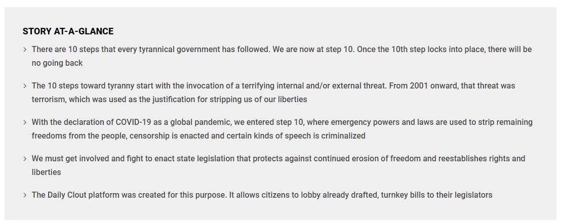 Naomi Wolf talks about the historical evolution of tyrannical governments. Ten steps. And by her reckoning, we are now at Step 10.