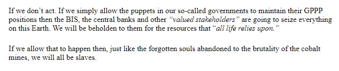 If we don’t act. If we simply allow the puppets in our so-called governments to maintain their GPPP positions then the BIS, the central banks and other “valued stakeholders” are going to seize everything on this Earth. We will be beholden to them for the resources that “all life relies upon.”