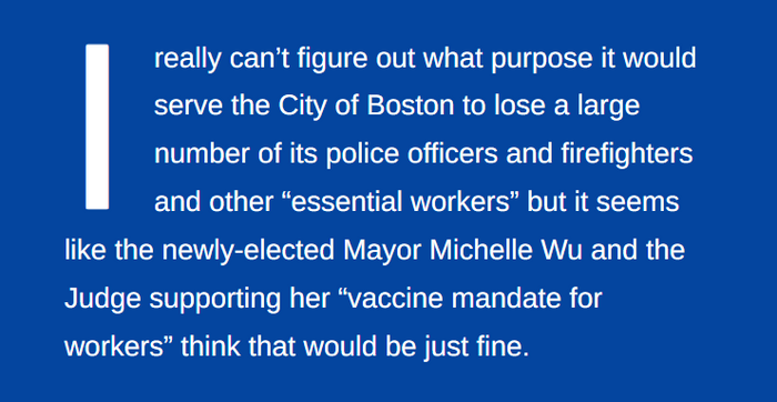 January 13, 2022 by Ramola D The Boston Herald reports this week that city police and firefighters lost their lawsuit against the city (for vaccine mandates) — filed by “Boston Police Superior Officers Federation, which filed the suit along with the Boston Police Detectives Benevolent Society and Boston Firefighters Union Local 718”. Image: Boston Herald – https://www.bostonherald.com/2021/12/27/michelle-wu-defends-vaccine-mandate-for-boston-city-workers-as-pregnant-police…Read More