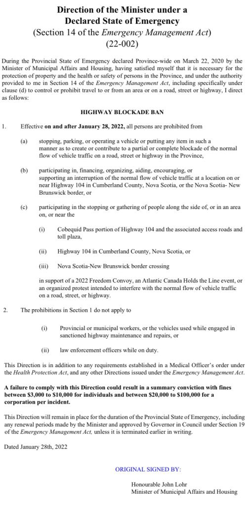 This is true outright tyranny at this point. NS ‘health commissioner’ Robert Strang did this before to a few protestors at Citadel hill last year, but now all the tens of thousands protesting this tyranny in Ottawa (and provincially) face a $10,000 fine for supporting the convoy, completely in violation of their Charter rights.
