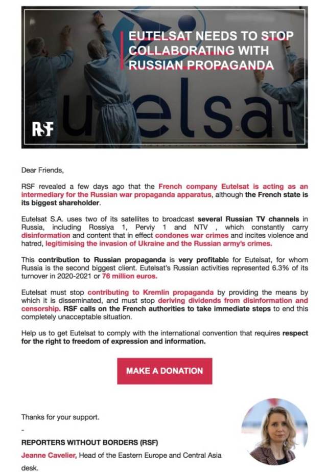 Are you kidding ? In the name of freedom of expression and information, RSF is demanding that satellite operator Eutelsat and the French State (20% of shares) censor the Russian media.