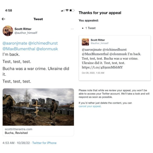 On October 28, 2022, new boss Elon Musk has sacked Vijaya Gadde, the sergeant major of censorship on Twitter. That is why Scott Ritter has tested for us the reliability of the US social network. The result is negative. Bucha narrative remains the backbone of the Western catechism about Ukraine