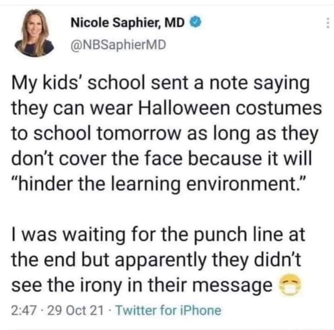 Nicole Saphier MD ~> No Halloween costume masks…