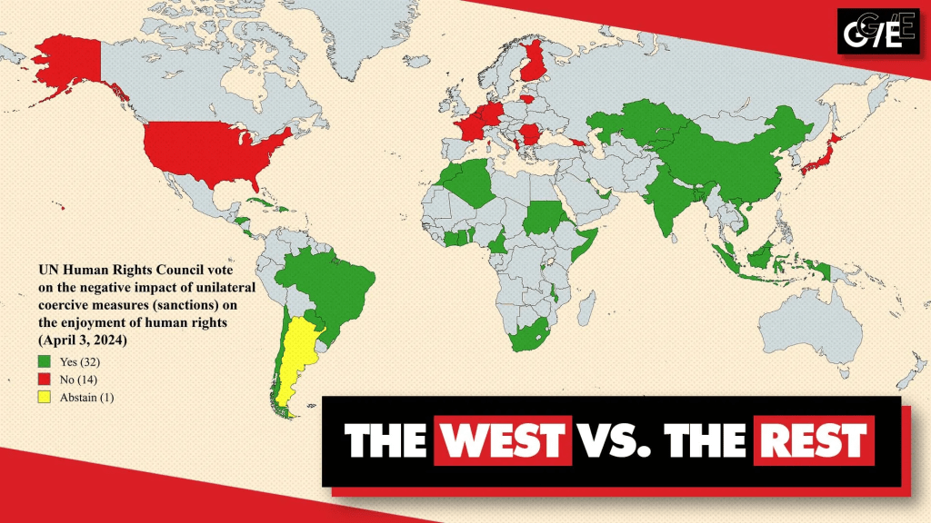 In the United Nations Human Rights Council, the West voted against the rest of the world, supporting illegal sanctions (known as unilateral coercive measures).